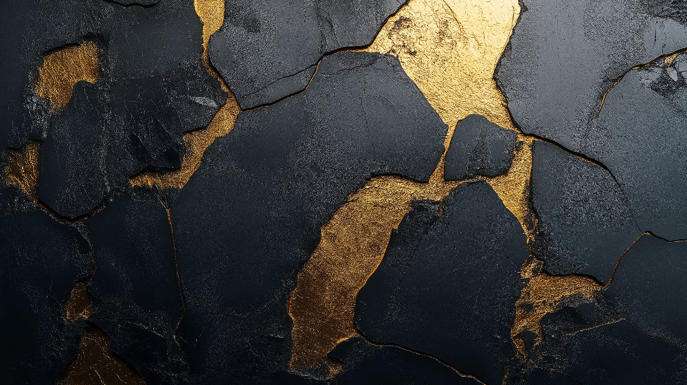 Ce papier peint marbre abstrait présente un jeu dramatique de surfaces noir charbon profond fracturées par des veines dorées lumineuses. Le design texturé crée un effet tridimensionnel sophistiqué, où les éléments de papier peint noir et or se fondent dans un motif organique rappelant les formations rocheuses naturelles. Chaque fissure dorée semble illuminer la surface sombre, créant un sentiment de profondeur et de mouvement à travers le mur.