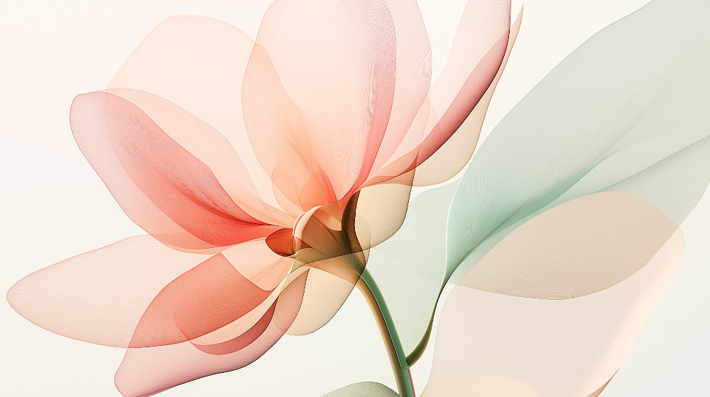 Ce papier peint floral abstrait capture l'essence de la grâce naturelle à travers des couches translucides de pétales rose doux qui se déploient comme une danse de lumière. La composition artistique mélange des tons corail-rose avec de délicats accents menthe, créant une fresque murale moderne éthérée qui semble flotter sans poids à la surface. La délicate transparence de chaque pétale révèle des détails complexes et des dégradés subtils, formant une abstraction botanique sophistiquée.