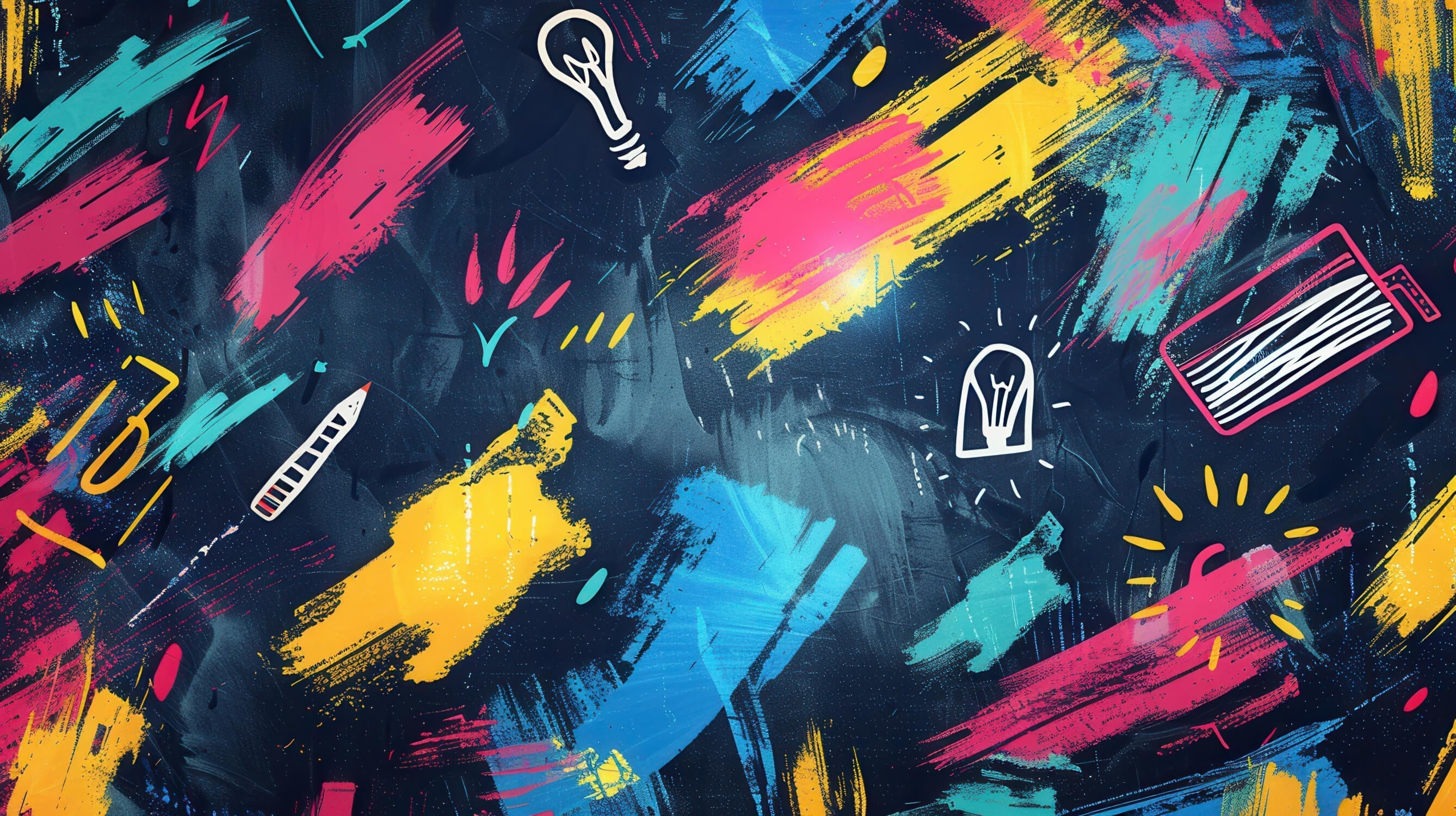Ce papier peint abstrait moderne déborde d'énergie dynamique grâce à sa palette de couleurs vives composée de touches turquoise, rose et jaune sur un fond bleu marine profond. Des motifs d'ampoules blanches ajoutent une étincelle créative au design, tandis que des coups de pinceau audacieux créent un sentiment de mouvement et de vitalité urbaine. La fresque murale artistique combine l'esthétique du street art avec des éléments de design contemporain, résultant en une déclaration visuelle puissante.