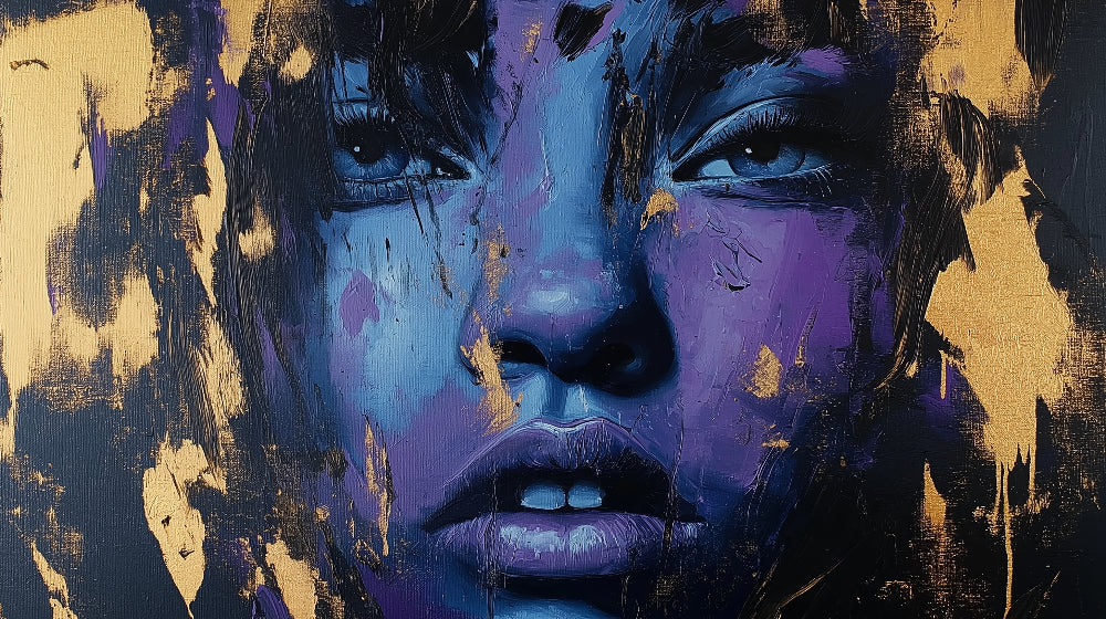 Ce papier peint portrait abstrait présente une expression artistique fascinante rendue dans une symphonie de bleus et de pourpres, accentuée de manière spectaculaire par des éclats d'or lumineux. Les coups de pinceau audacieux et les éléments texturés créent un jeu captivant de lumière et d'ombre, tandis que la fresque d'art contemporain capture un regard intense qui semble percer la composition avec une profondeur et une émotion remarquables.