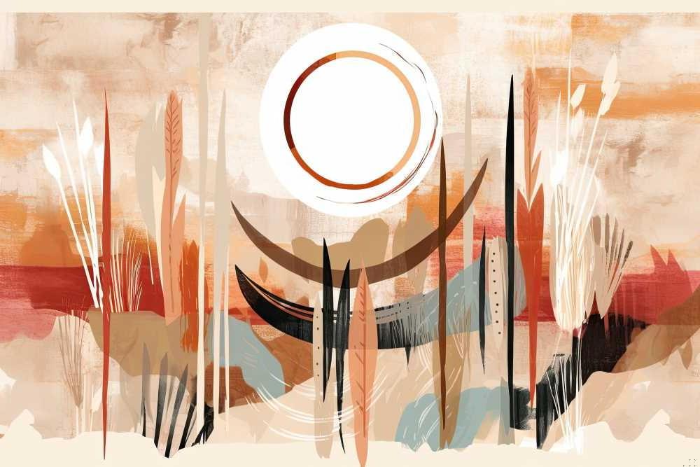 Ce papier peint paysage abstrait capture l'essence de l'art moderne avec son mélange sophistiqué de tons terre cuite, beige et ardoise. Le motif circulaire saisissant du soleil couronne une composition de formes géométriques rappelant des roseaux et de courbes gracieuses, créant une fresque murale contemporaine qui incarne à la fois chaleur et raffinement artistique. L'interaction des formes organiques et des éléments abstraits produit une danse harmonieuse de lumière et d'ombre, tandis que la palette de couleurs terreuses ajoute profondeur et dimension à l'ensemble.