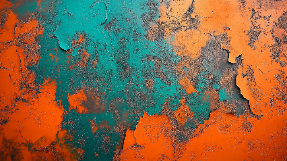 Cette peinture murale abstraite présente un jeu saisissant de tons turquoise profond et orange vif, créant une esthétique industrielle fascinante. La surface texturée révèle un motif complexe de couches usées et d'érosion organique, rappelant le métal oxydé et la dégradation urbaine. Chaque détail de ce papier peint abstrait moderne raconte une histoire de transformation, où des verts émeraude riches se mêlent à des teintes terracotta chaudes dans une danse sophistiquée de couleur et de texture.