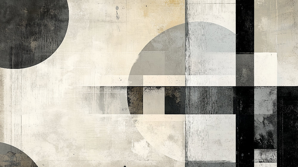 Ce papier peint géométrique abstrait présente une interaction sophistiquée de formes circulaires et rectangulaires dans une palette raffinée de noir, beige et tons gris doux. La composition fusionne des formes architecturales audacieuses avec des éléments texturaux subtils, créant une esthétique moderniste aux nuances industrielles. Le papier peint géométrique contemporain présente des proportions soigneusement équilibrées et des lignes épurées qui évoquent l'essence du design minimaliste.