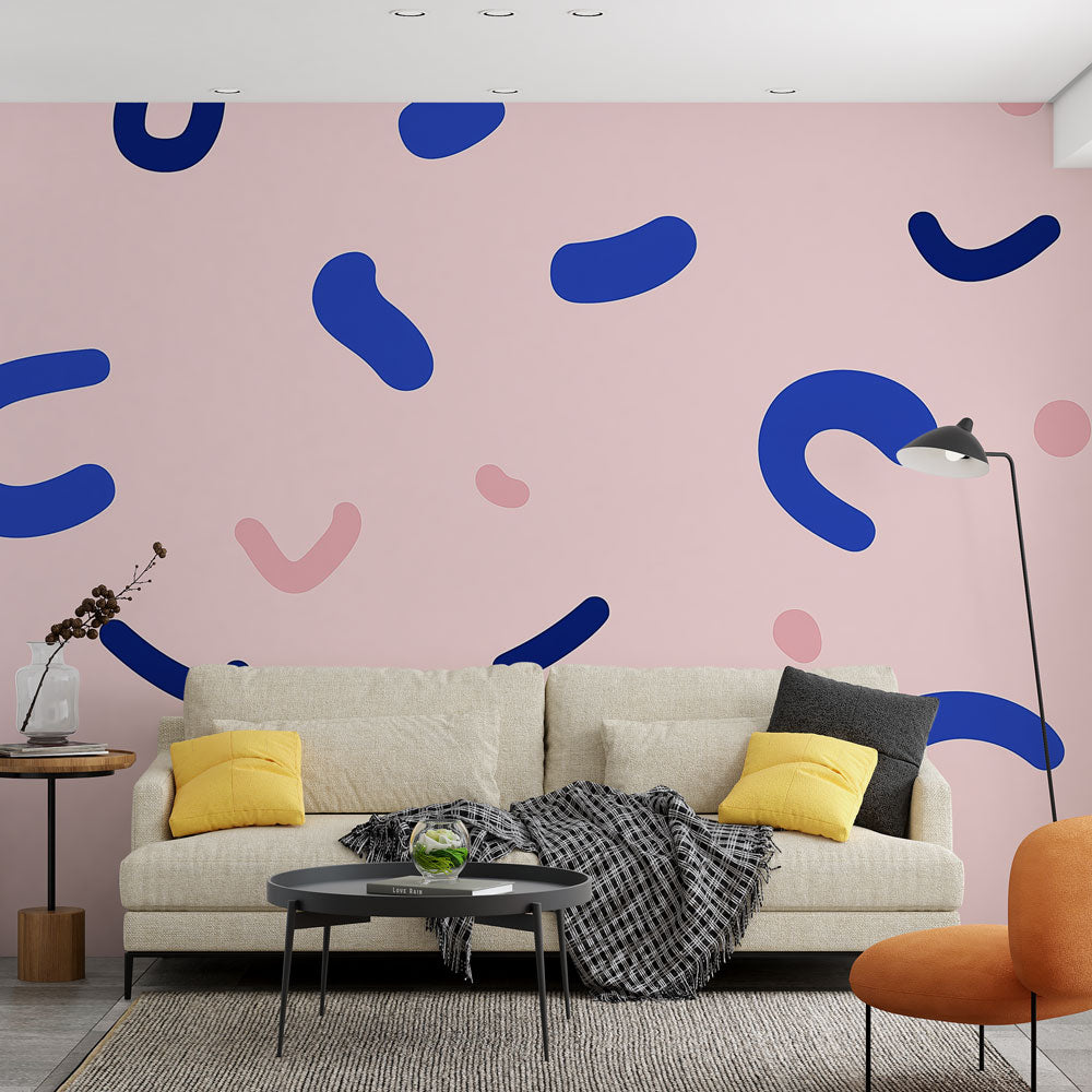 Ce papier peint à motif abstrait présente une composition captivante de formes fluides qui dansent sur une toile rose pâle. Des formes courbes bleu marine audacieuses créent un contraste saisissant avec le fond doux, tandis que des formes organiques rose clair ajoutent une profondeur et un mouvement subtils. Le papier peint géométrique moderne met en valeur une disposition ludique mais sophistiquée qui attire l'œil par son asymétrie équilibrée et son attrait contemporain.