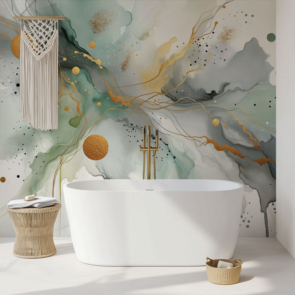 Ce papier peint aquarelle abstrait présente un mélange fascinant de nuances vert sauge et gris tempête, entrelacées d'accents dorés lumineux. Des motifs fluides et organiques coulent à travers la surface comme des ruisseaux de métal liquide, tandis que de délicates taches noires ajoutent profondeur et texture. Le papier peint abstrait moderne crée un jeu sophistiqué de lumière et d'ombre, avec des cercles dorés métalliques captant la lumière comme des corps célestes suspendus dans une atmosphère brumeuse.