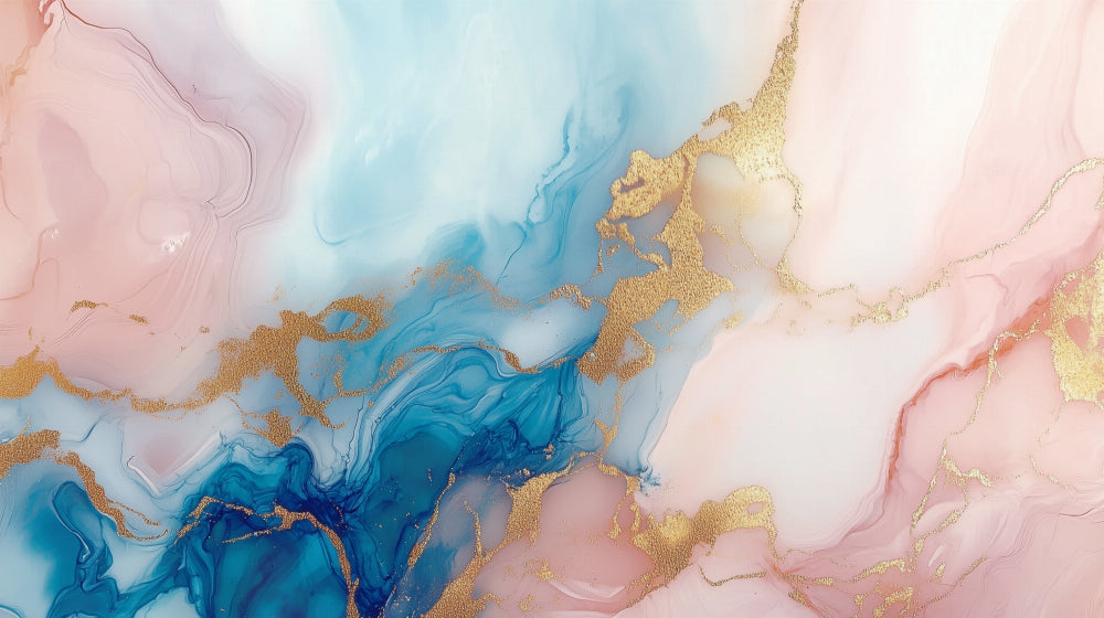 Papier Peint Mural Abstrait | Marbre Rose et Bleu avec Accents Dorés