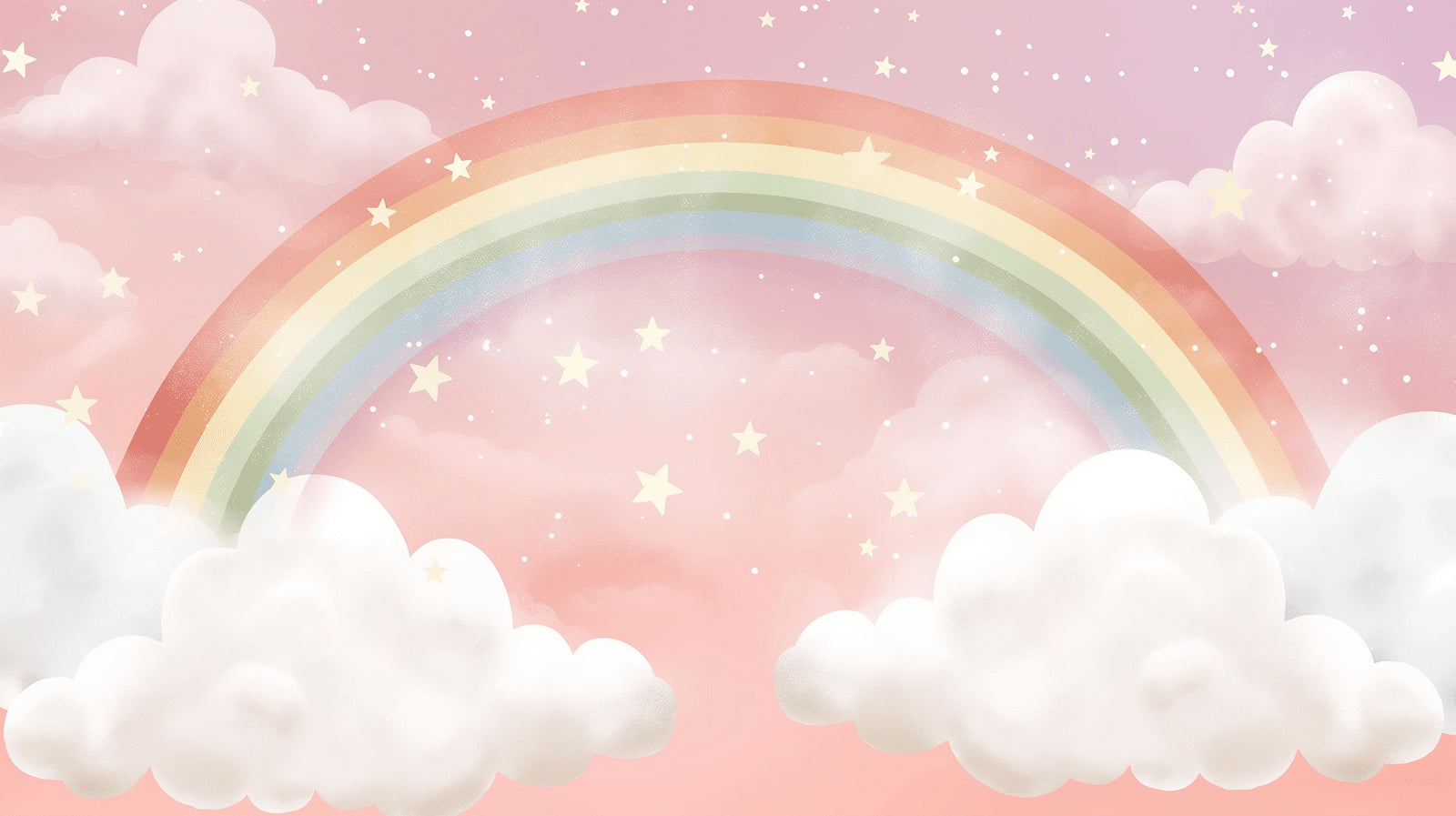 Ce papier peint arc-en-ciel enchanteur crée une atmosphère de rêve avec son ciel rose doux et ses formations nuageuses éthérées. L'arc doux d'un arc-en-ciel pastel s'étend à travers la scène, orné d'étoiles délicates qui scintillent comme des vœux lointains. Des nuages blancs duveteux flottent sereinement en dessous, créant un paysage magique qui combine fantaisie et éléments artistiques raffinés.