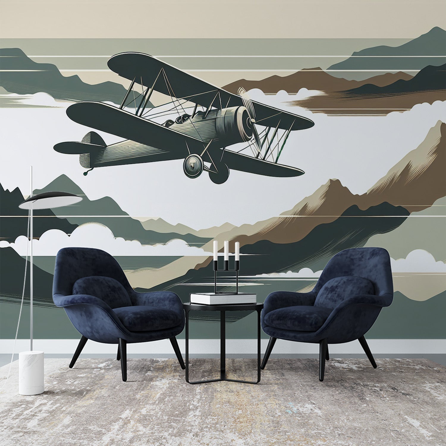 Ce papier peint avion vintage capture l'âge d'or de l'aviation avec un biplan magnifiquement détaillé survolant un majestueux paysage montagneux. Le design présente un avion classique rendu dans des tons vert forêt profonde, sur un fond sophistiqué de nuances de sauge, beige et marron. La fresque murale aviation combine des lignes géométriques nettes avec des nuages doux et ondulants pour créer une composition harmonieuse qui évoque à la fois l'aventure et le raffinement artistique.