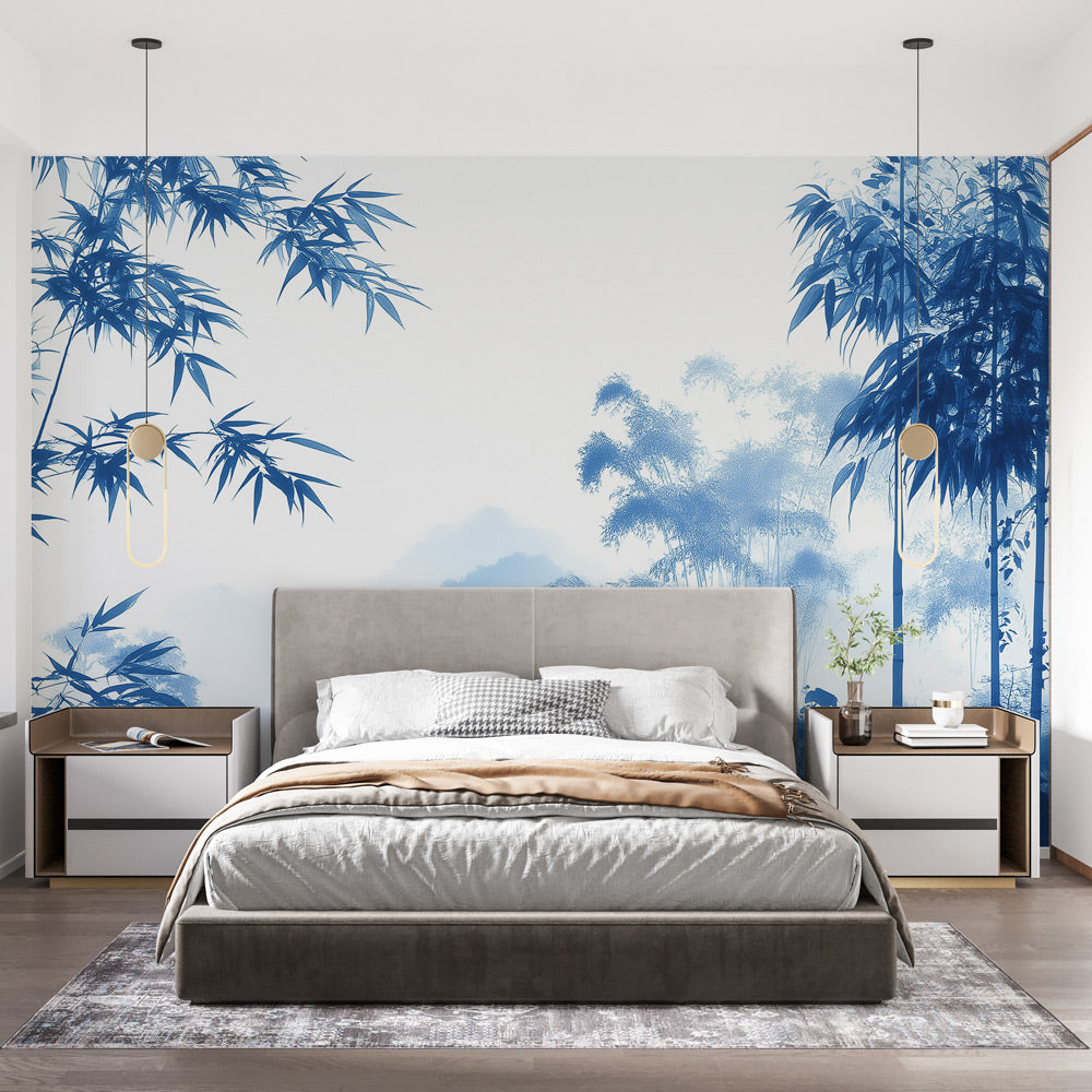Papier Peint Mural Bambou | Design Jardin Japonais Bleu
