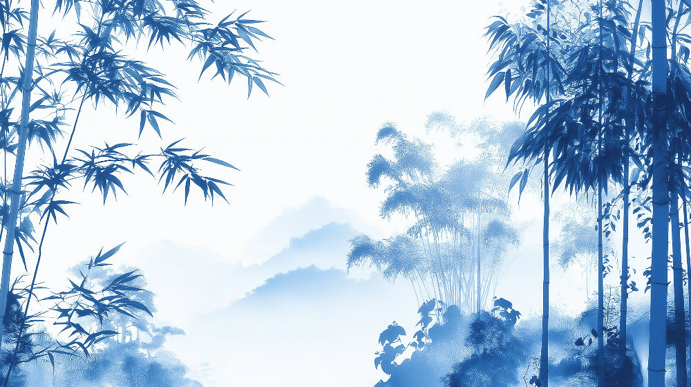 Ce papier peint mural en bambou capture l'essence d'un jardin japonais brumeux avec sa palette bleue éthérée et son art botanique délicat. De gracieux feuilles de bambou créent des silhouettes complexes sur un fond blanc doux, tandis que des montagnes lointaines émergent à travers de douces brumes bleues. Le papier peint mural oriental en bambou présente un équilibre magistral entre l'espace négatif et le feuillage détaillé, créant une sensation de profondeur qui attire le regard dans ce paysage tranquille.