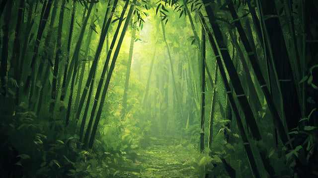 Ce papier peint forêt de bambous enchanteur capture la beauté éthérée des tiges de bambou imposantes encadrant un chemin mystique baigné d'une lumière vert doré. L'interaction magistrale des tiges de bambou émeraude profond et du feuillage lumineux crée un effet de profondeur saisissant, tandis que de délicats rayons de soleil filtrent à travers la canopée, projetant une lueur surnaturelle sur la fresque murale de bambou oriental. Chaque détail, des nœuds texturés du bambou aux courbes douces des feuilles, donne vie à l'architecture authentique de la forêt.
