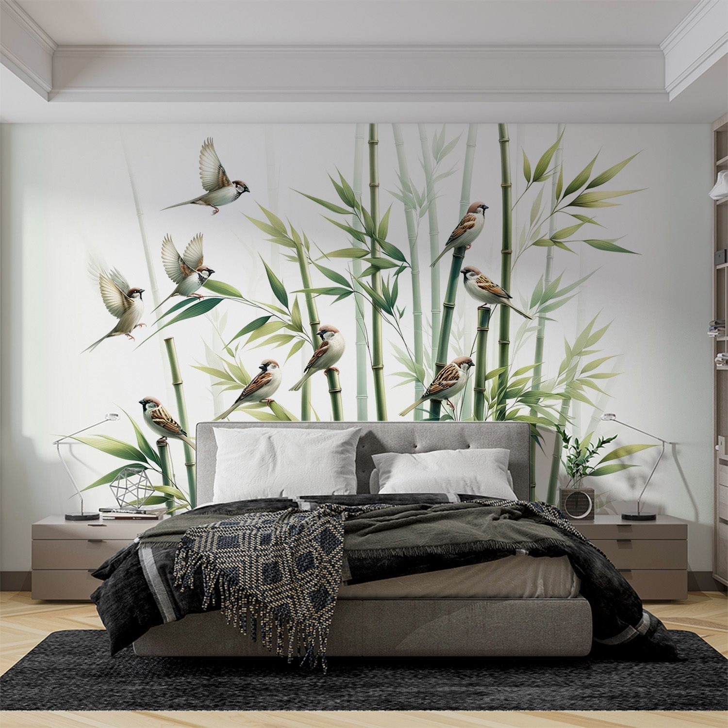 Papier Peint Mural en Bambou | Oiseaux et Design de Jardin Zen