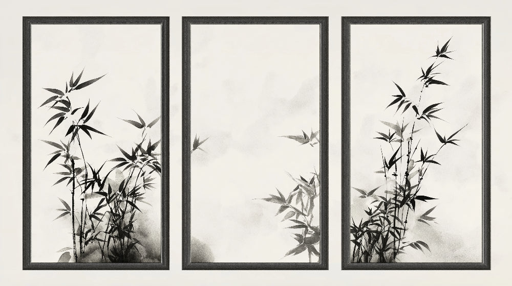 Cette fresque murale en bambou met en valeur la grâce intemporelle de la peinture traditionnelle japonaise à l'encre, où de délicats troncs de bambou noirs émergent sur un fond blanc immaculé. La composition artistique s'étend sur trois panneaux, créant un effet triptyque où des tiges et des feuilles gracieuses dansent à travers la surface. Chaque panneau de papier peint bambou oriental capture l'essence de l'esthétique asiatique minimaliste, avec des coups de pinceau précis dépeignant l'élégance naturelle du bambou dans des profondeurs et densités variées.