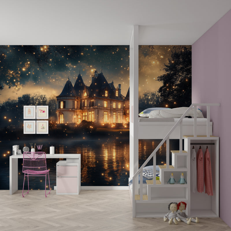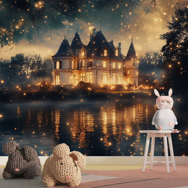 Des étoiles dorées et des lueurs douces font briller ce papier peint mural château magique jour et nuit.