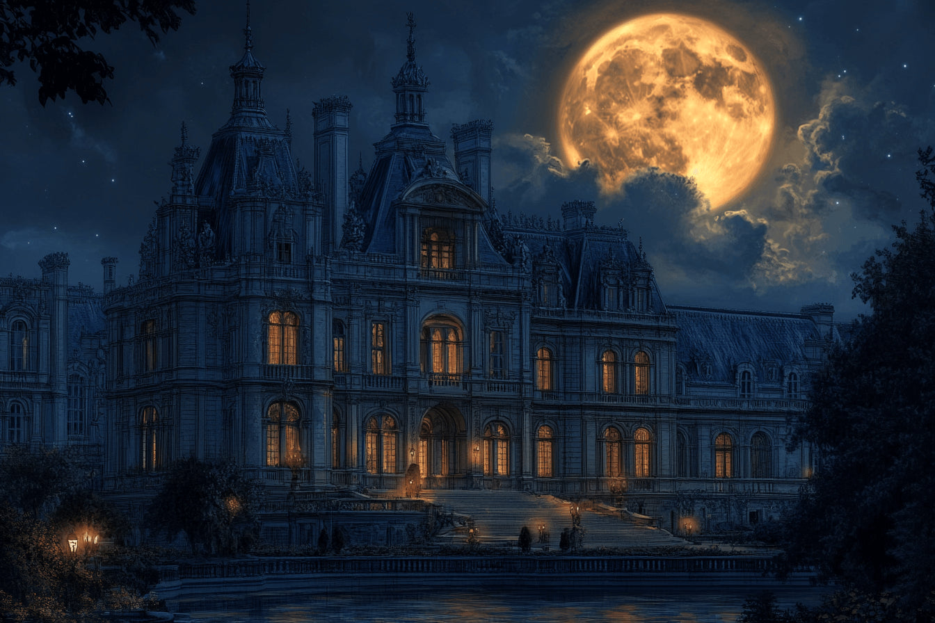 Ce papier peint château gothique présente un chef-d'œuvre architectural magnifique baigné dans la lueur éthérée d'une lune ambrée. La façade complexe du palais de style français comporte des fenêtres illuminées qui diffusent une lumière dorée chaude contre le ciel nocturne teinté de bleu profond. La fresque murale château au clair de lune capture chaque détail architectural, des flèches ornées aux élégantes arcades, créant une scène de grandeur intemporelle et de mystère.