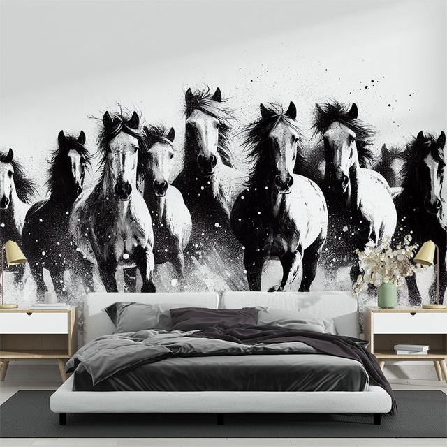 Papier Peint Mural Chevaux | Troupeau Noir et Blanc en Course
