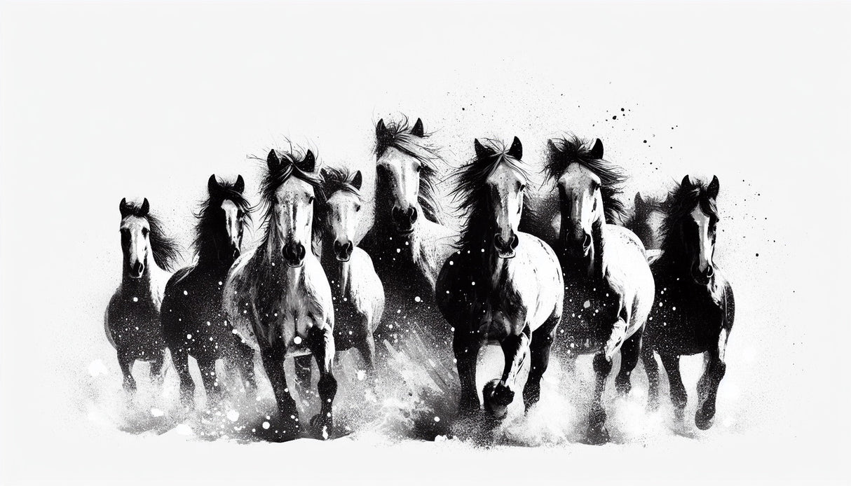 Ce papier peint cheval noir et blanc saisissant capture la puissance brute et la grâce d'un troupeau sauvage au galop. La composition monochromatique dramatique met en scène huit chevaux majestueux aux crinières flottantes, leurs formes musclées rendues en traits d'encre audacieux sur un fond blanc brumeux. Des éclaboussures artistiques et des points créent un sentiment de mouvement et d'énergie, tandis que le design du papier peint cheval au galop démontre un contraste magistral entre lumière et ombre.