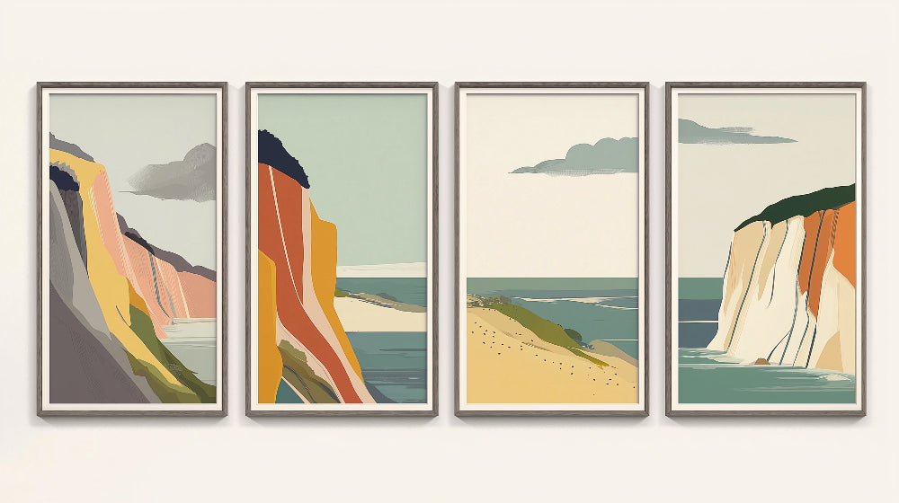 Ce papier peint paysage côtier présente une série captivante de formations de falaises modernistes dans un mélange harmonieux de tons terreux et de nuances inspirées de la mer. L'interprétation artistique met en scène des falaises en terre cuite chaude, ocre doré et rose doux s'élevant de manière spectaculaire contre des eaux vert sauge sereines. Chaque panneau de ce papier peint abstrait de plage raconte une partie d'une histoire plus grande, des formations côtières imposantes aux rivages sablonneux doux, créant une vue panoramique continue.