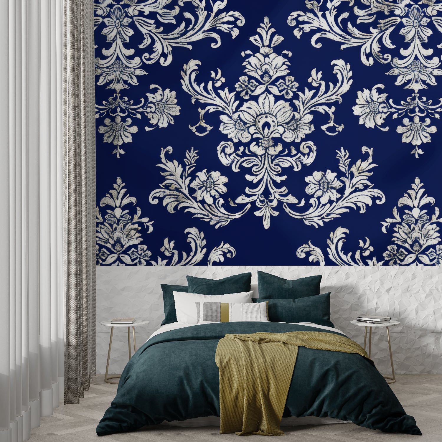 Cette fresque murale papier peint baroque présente un exquis jeu de bleu marine profond et de blanc éclatant, mettant en vedette un magnifique motif damassé qui évoque une élégance intemporelle. Les motifs floraux complexes et les arabesques fluides créent un rythme sophistiqué sur le mur, tandis que le design damassé classique apporte un sentiment de luxe traditionnel réimaginé pour les espaces contemporains.