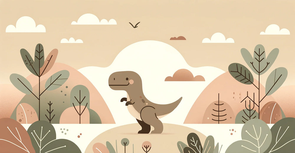 Ce papier peint mural dinosaure crée une scène préhistorique fantaisiste avec un charmant T-Rex en pièce maîtresse. Sur un fond beige doux, le design présente un dinosaure marron amical entouré d'éléments naturels stylisés dans des teintes apaisantes de vert sauge et de terre cuite. Des nuages blancs et duveteux dérivent dans le ciel tandis qu'un oiseau solitaire plane au-dessus, ajoutant du mouvement à ce papier peint dinosaure pour enfants qui équilibre parfaitement ludisme et sophistication artistique.