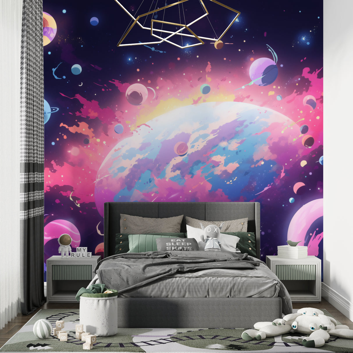 Chaque nuit devient une aventure avec cette fresque murale de chambre galaxie.