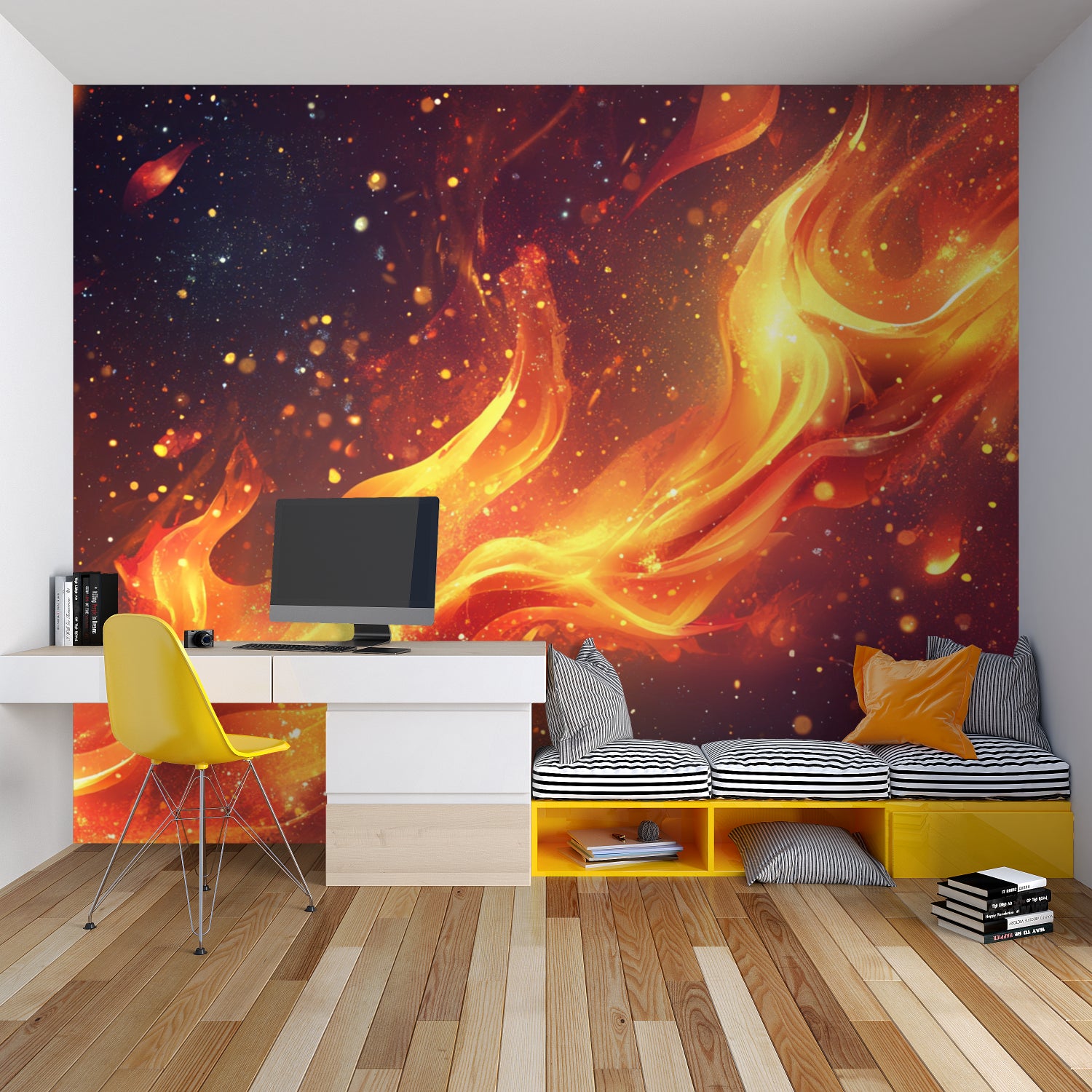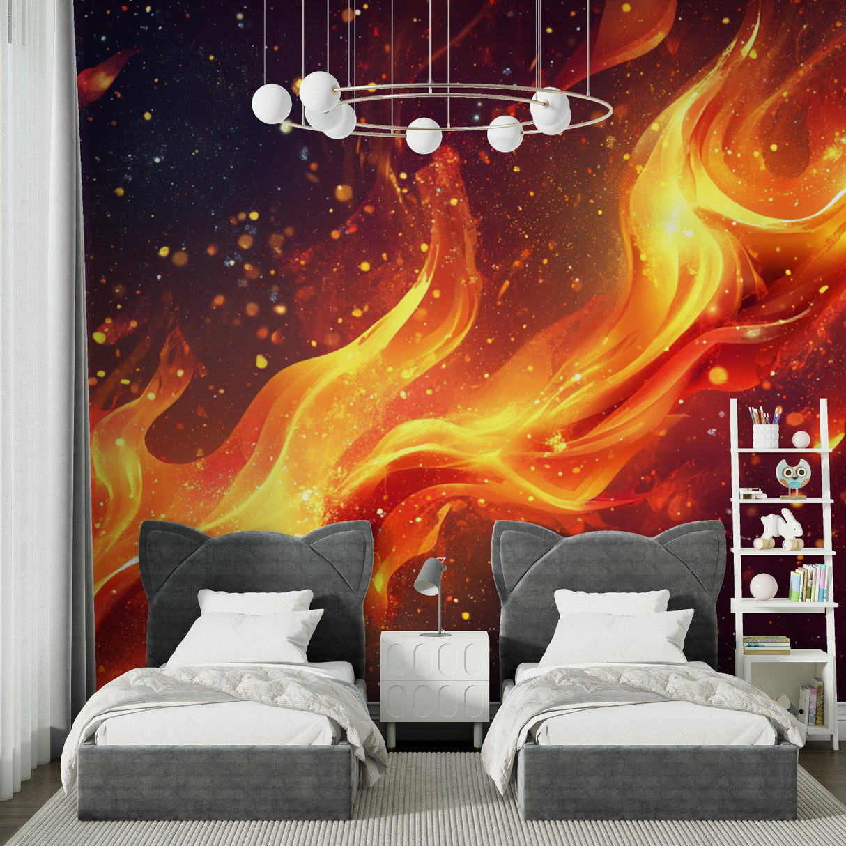 Ce papier peint feu cosmique présente un spectacle fascinant de flammes célestes dansant sur un fond d'espace profond. Les tourbillons dynamiques de flammes orange vif et jaune créent un contraste spectaculaire avec le cosmos violet-noir riche, tandis que des étincelles dorées dispersées illuminent le design comme des étoiles lointaines. Le papier peint galaxie capture l'énergie brute et la beauté d'un phénomène cosmique avec un détail époustouflant.