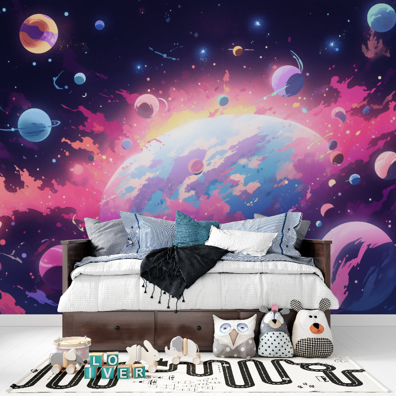 Ce papier peint nébuleuse spatiale dévoile une vue cosmique à couper le souffle où des teintes vibrantes de rose et de violet dansent à travers une galaxie étoilée. Le design présente une gamme fascinante de corps célestes, des planètes lumineuses aux nébuleuses tourbillonnantes, tous rendus dans des couleurs riches et oniriques. La fresque murale galaxie crée une atmosphère éthérée avec son mélange magistral de bleus profonds, de roses éclatants et de violets doux, capturant l'infinie merveille du cosmos.