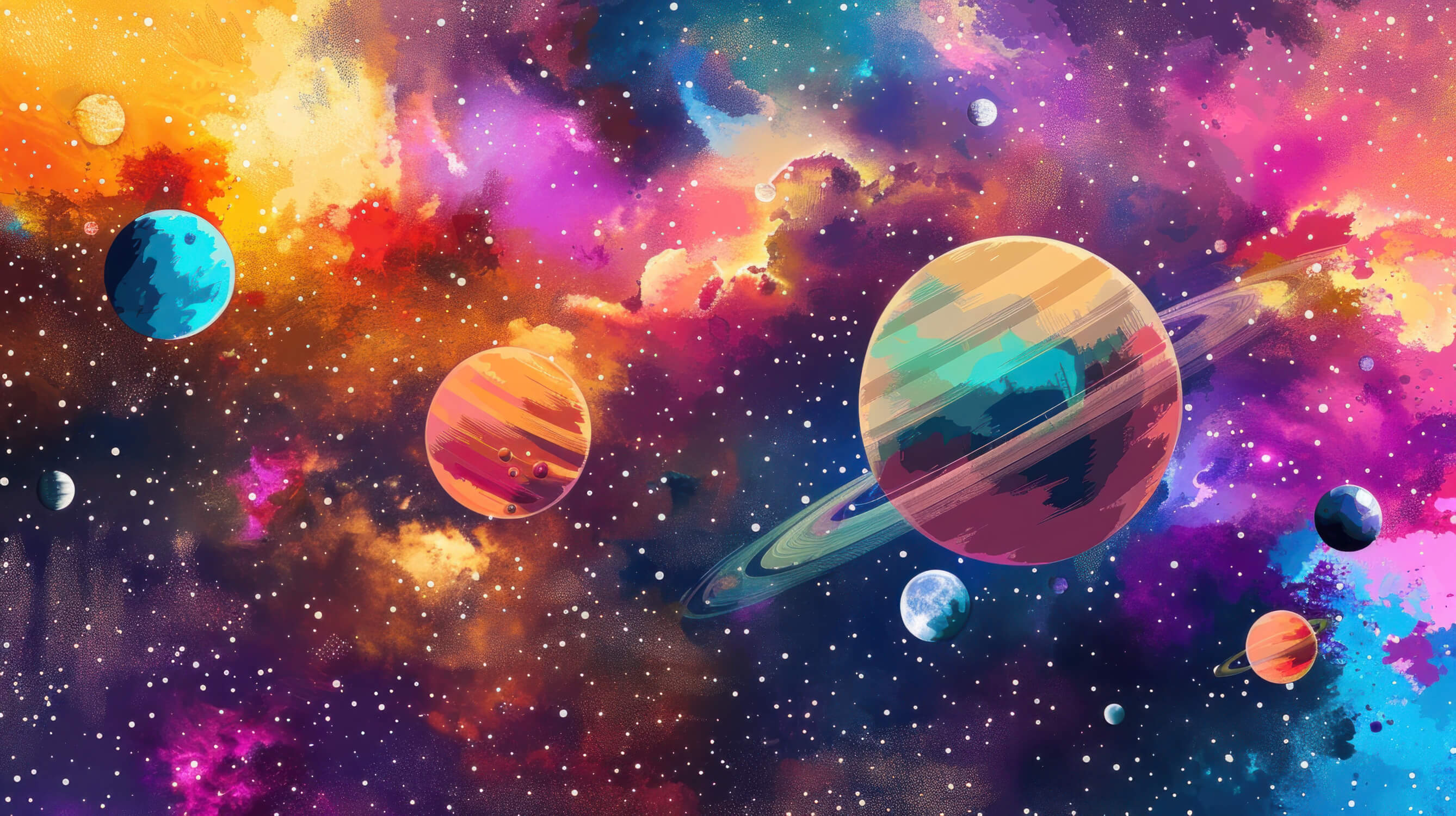 Ce papier peint galaxie spatiale enchanteur dévoile une scène cosmique fantaisiste où des planètes charmantes aux expressions ludiques dansent sur une toile céleste vibrante. Le design présente une spectaculaire palette de couleurs, allant des pourpres profonds et turquoise riche aux oranges chauds et jaunes, créant une fresque murale galaxie fascinante. Des étoiles scintillantes et des tourbillons cosmiques dynamiques ajoutent du mouvement et de la profondeur à cette délicieuse exposition astronomique.