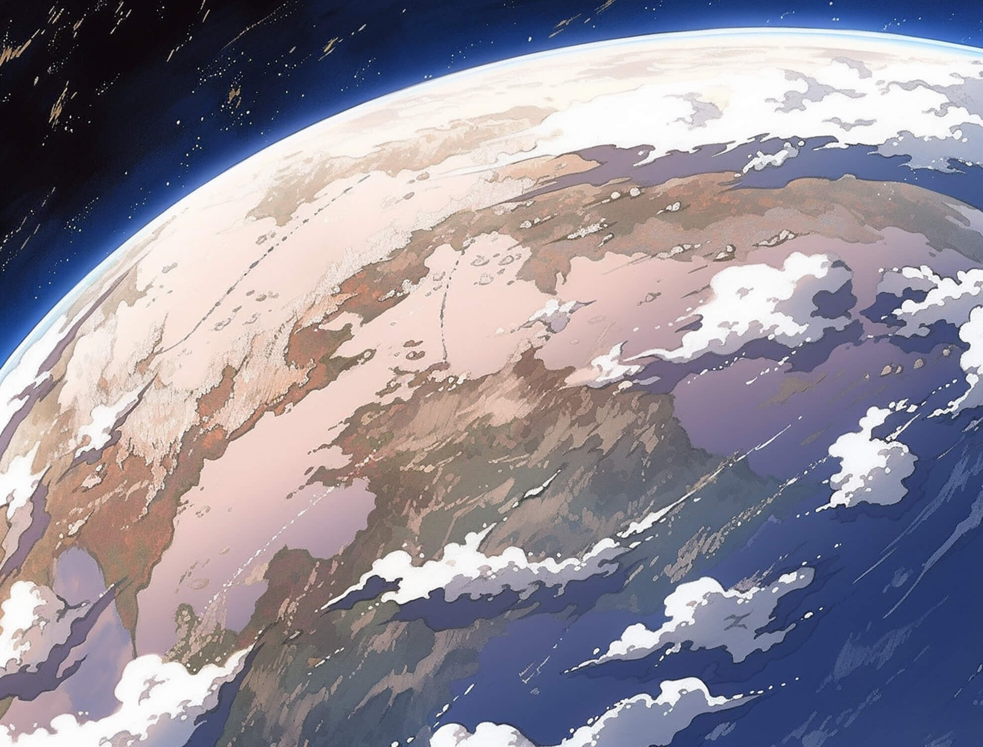Cette fresque murale papier peint espace présente une vue céleste à couper le souffle, mettant en scène un vaste paysage planétaire sur fond des profondeurs infinies de l'espace. La composition riche mêle les tons beiges et bruns terreux de la surface de la planète aux bleus profonds de minuit, créant un panorama cosmique dramatique. Des formations nuageuses délicates et des détails étoilés ajoutent de la profondeur à cette fresque murale mur galaxie, en faisant un point focal fascinant qui attire le regard dans son vaste espace céleste.