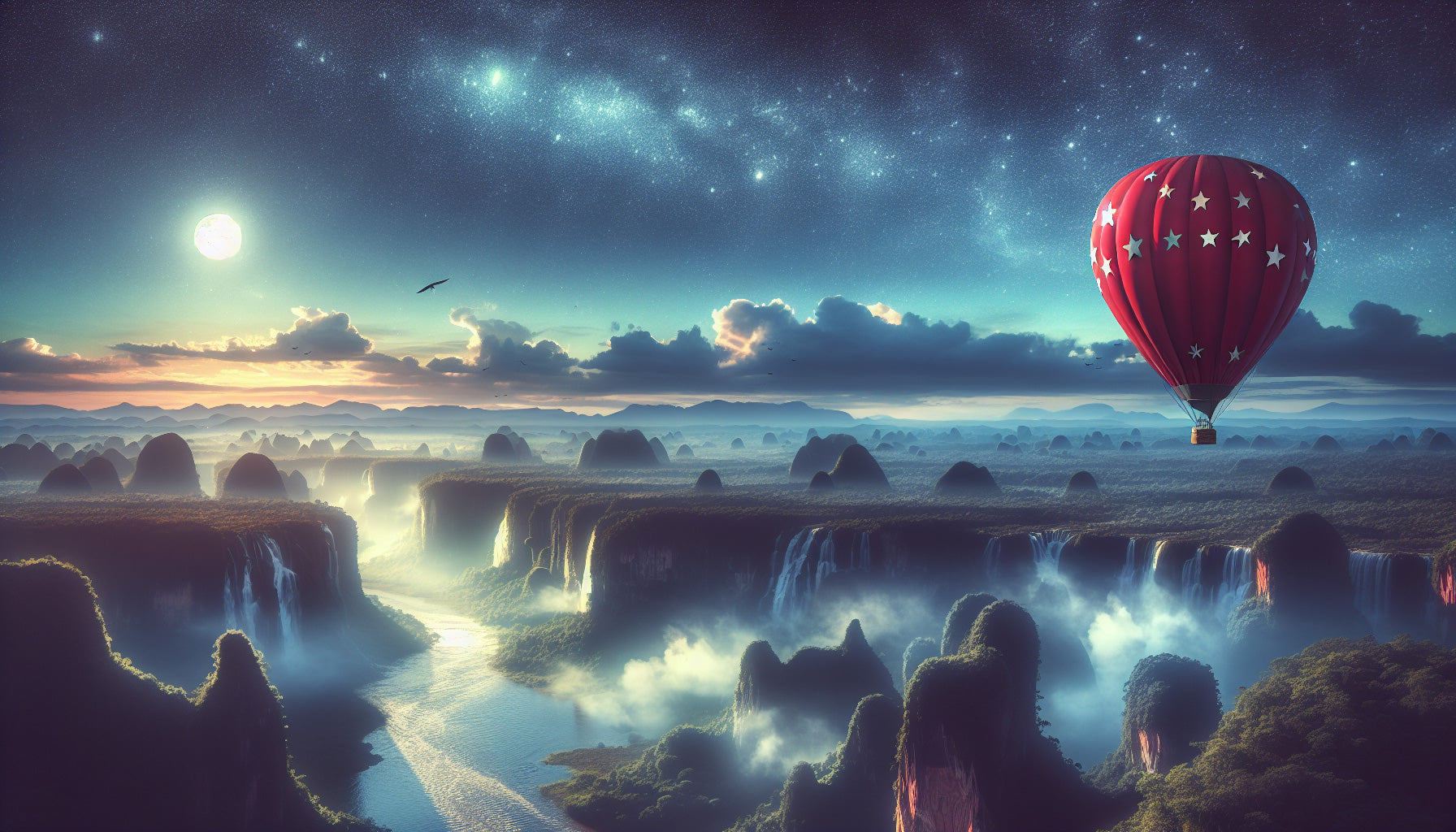 Ce papier peint paysage fantastique capture une scène à couper le souffle où des cascades brumeuses dévalent des montagnes mystérieuses sous un ciel étoilé. La composition éthérée présente une montgolfière rouge ornée d'étoiles, flottant gracieusement sur un fond de cieux turquoise-bleu et de lumière dorée. Le papier peint panoramique de cascade crée une atmosphère de rêve avec son jeu de lumière et d'ombre, tandis que la Voie lactée s'étire à travers la toile céleste.