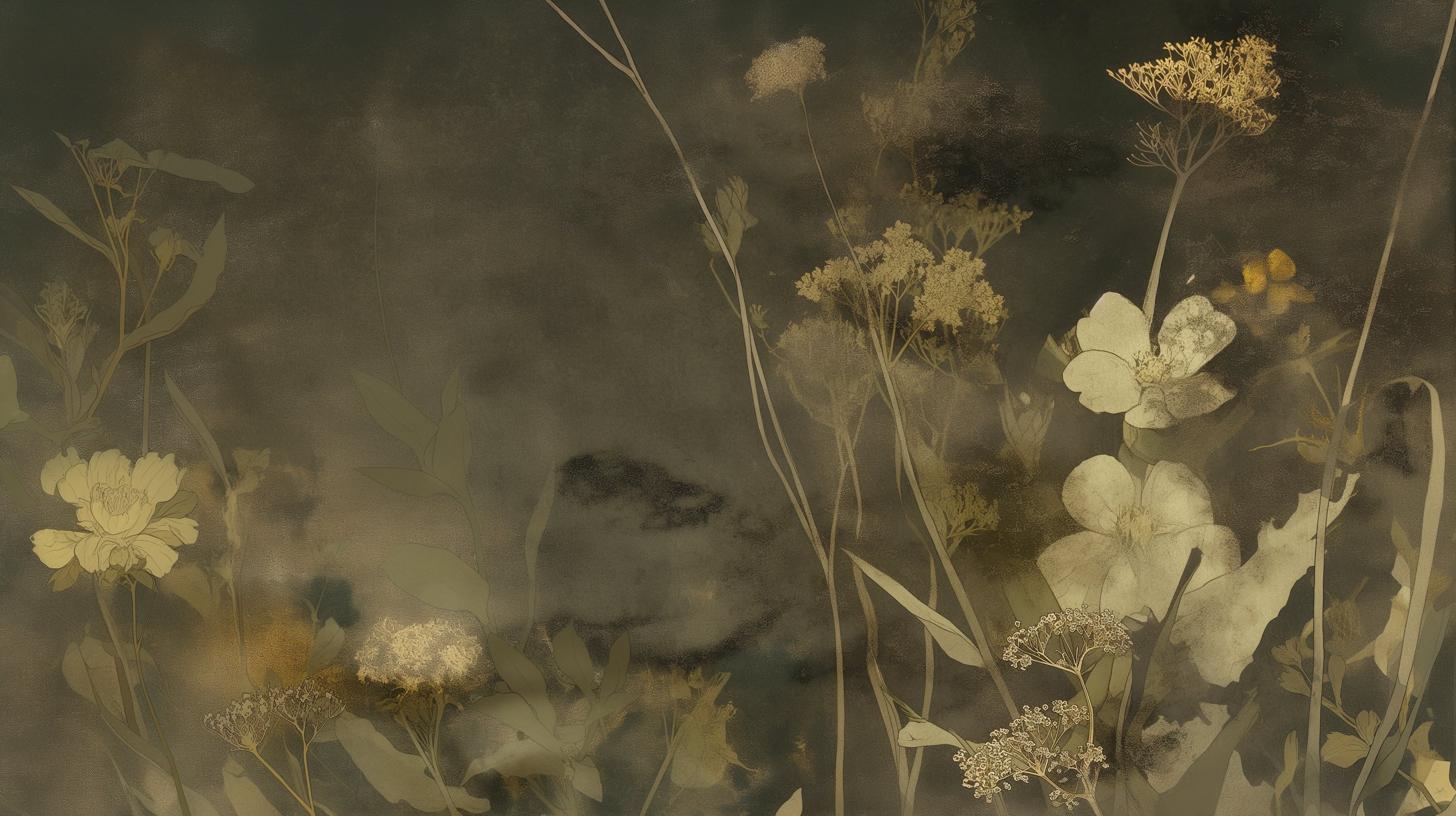 Cette fresque murale florale enchanteresse présente une composition magistrale de fleurs sauvages dorées et de délicates plantes botaniques sur un riche fond vert olive. Le design éthéré capture des tiges fleuries et des fleurs en forme de parapluie dans des tons dorés lumineux, créant un jeu sophistiqué de lumière et d'ombre. Le papier peint botanique offre une qualité onirique et atmosphérique qui ajoute profondeur et mystère à l'ensemble de la composition.