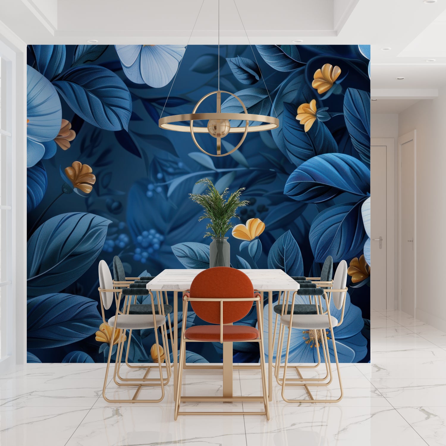 Papier Peint Mural Floral | Feuilles Bleues avec Accents Dorés