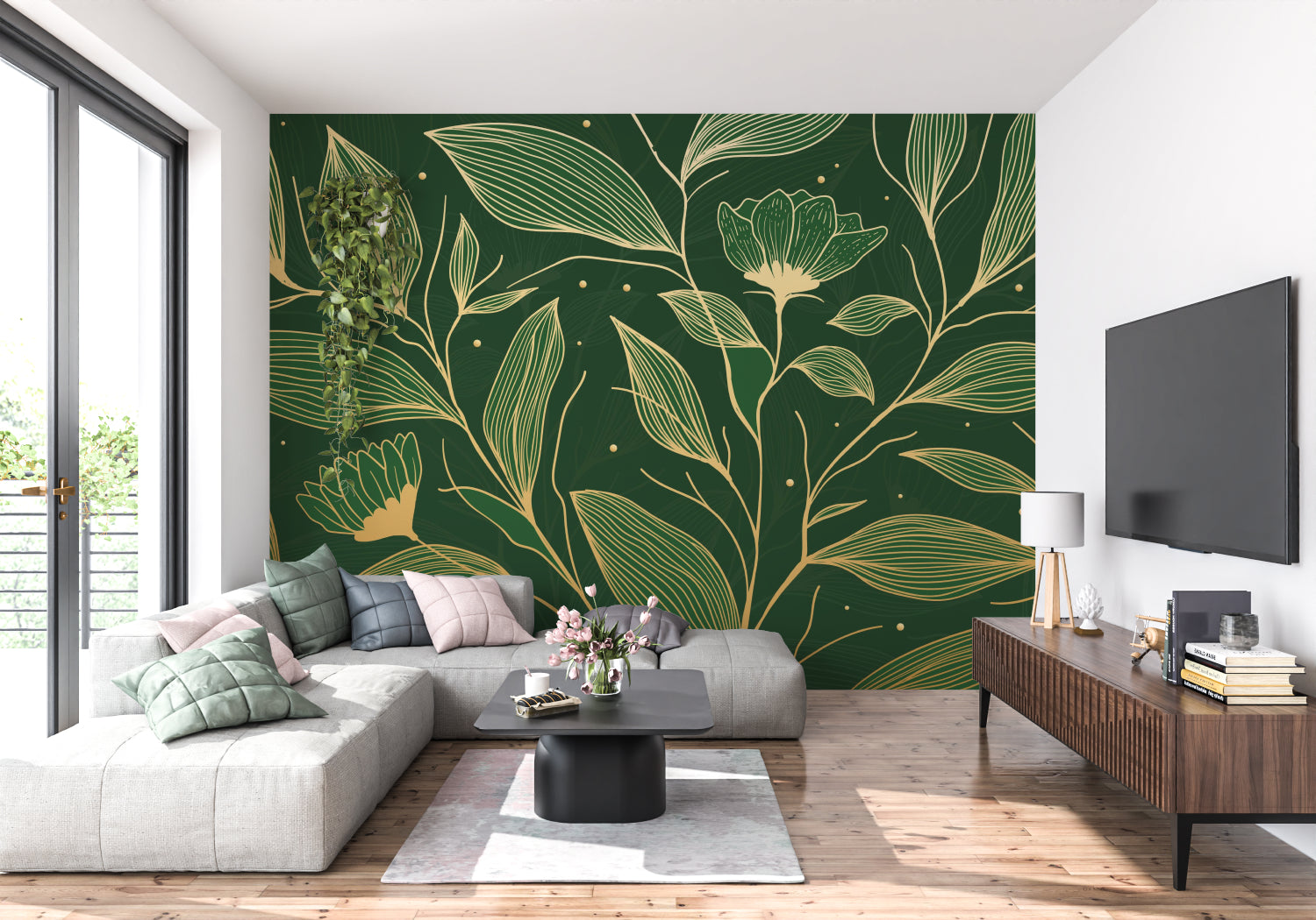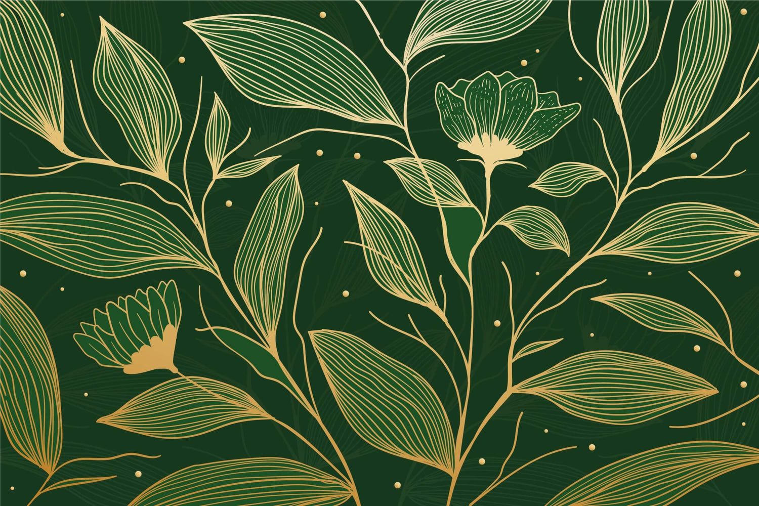 Papier Peint Mural Floral | Feuilles Dorées sur Vert Émeraude