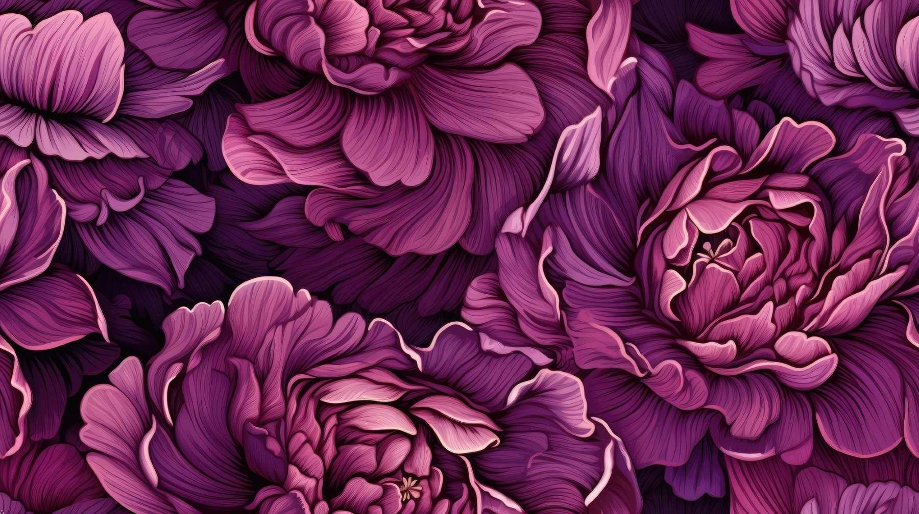 Ce papier peint floral violet présente de grandes fleurs de pivoine rendues dans des tons luxueux de violet profond et de bordeaux. Chaque pétale superposé est minutieusement détaillé, créant un effet tridimensionnel qui apporte profondeur et mouvement au mur. Le papier peint pivoine dramatique présente des dégradés riches allant du prune profond au rose doux, sur un fond sombre qui accentue l'impact artistique de ces magnifiques fleurs.
