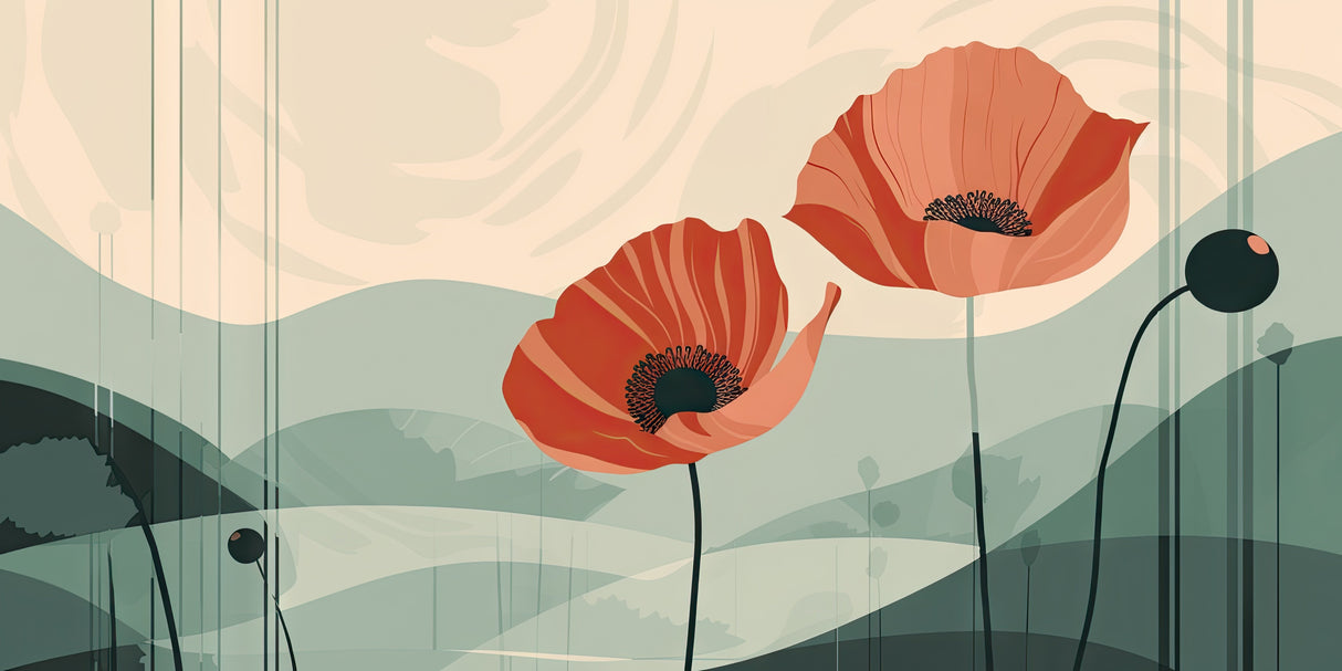 Ce papier peint coquelicot présente des fleurs corail dramatiques sur un paysage désertique serein. Le design mural floral surdimensionné met en scène deux magnifiques coquelicots avec des centres noirs complexes, leurs pétales rendus dans des tons doux de terre cuite qui capturent l'essence de la beauté naturelle. Le dégradé doux du beige au vert sauge crée un arrière-plan paisible, tandis que le cactus en silhouette ajoute un élément contemporain inspiré du désert.