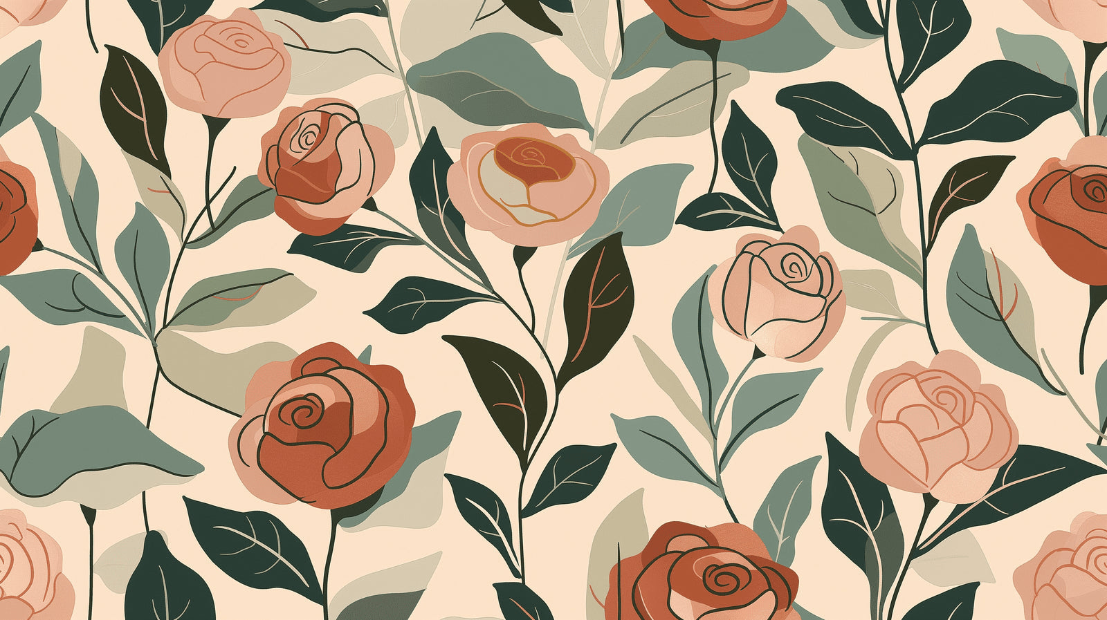 Ce papier peint floral rose présente un motif habilement composé de grandes fleurs dans des tons sophistiqués de terre cuite et de rose pâle sur un fond beige chaud. Le feuillage vert émeraude crée un contraste saisissant tout en ajoutant un mouvement naturel grâce à des tiges et des feuilles gracieusement courbées. Chaque élément de papier peint rose vintage est rendu dans un style moderne et artistique qui équilibre des contours graphiques audacieux avec des transitions de couleur subtiles.