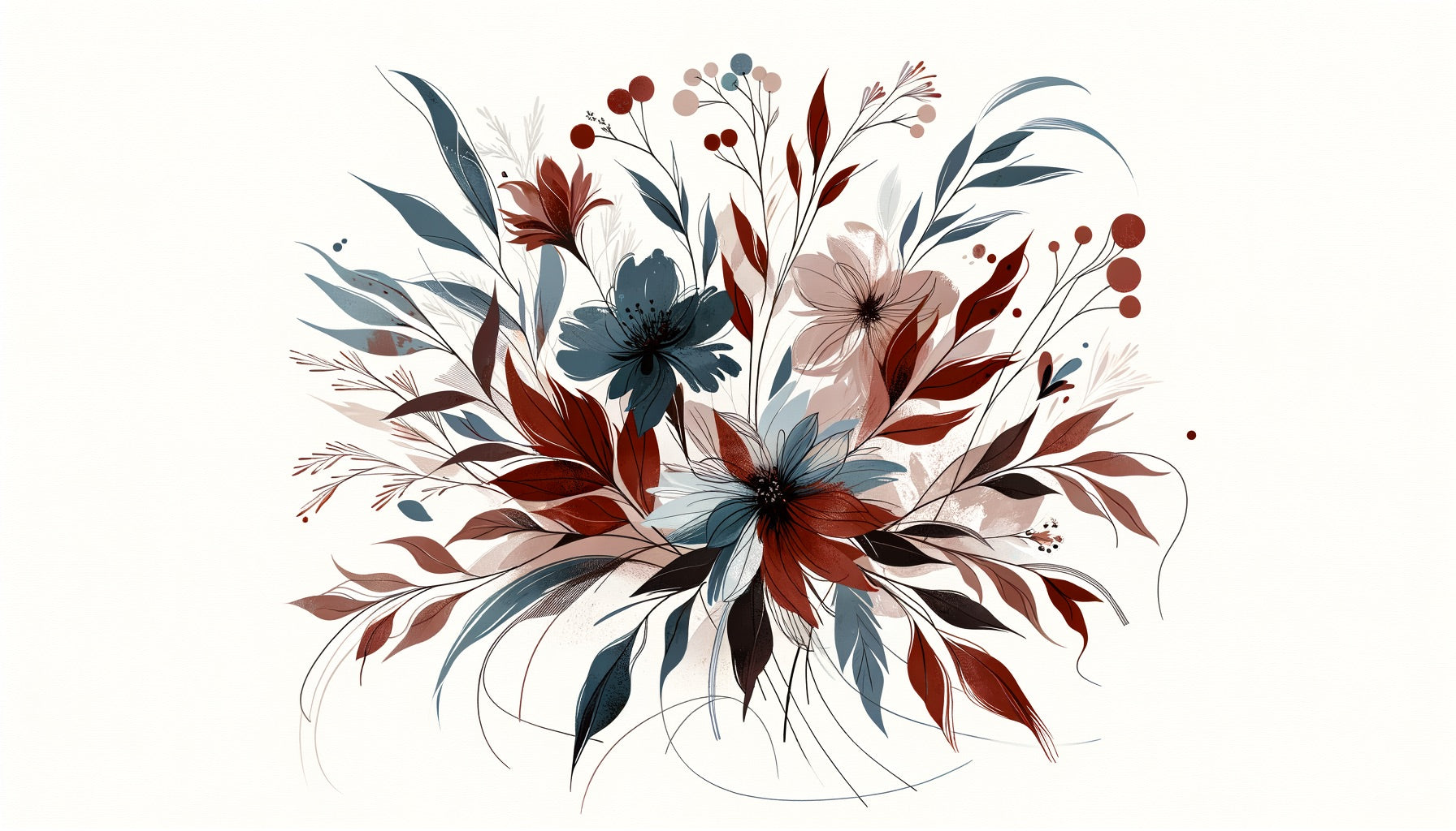Ce papier peint floral moderne présente une disposition artistique d'éléments botaniques dans une palette de couleurs sophistiquée. De grandes fleurs aux tons terre cuite profond et bleu acier créent un point focal saisissant, tandis que des baies délicates et un feuillage gracieux ajoutent du mouvement et de la profondeur. La fresque murale botanique propose une composition élégante où chaque élément s'enchaîne naturellement, créant une danse harmonieuse de formes et de couleurs sur un fond blanc immaculé.
