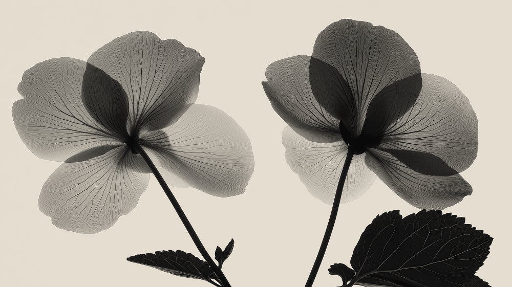 Ce papier peint floral noir et blanc met en valeur la délicate beauté des fleurs de bégonia à travers une perspective extraordinaire semblable à une radiographie. Deux magnifiques fleurs flottent sur un fond beige serein, leurs pétales translucides révélant des motifs veineux complexes et des dégradés subtils de gris. Le papier peint botanique monochrome capture chaque détail délicat, des courbes douces de chaque pétale aux silhouettes nettes des feuilles en dessous, créant une étude sophistiquée de la lumière et de l'ombre.