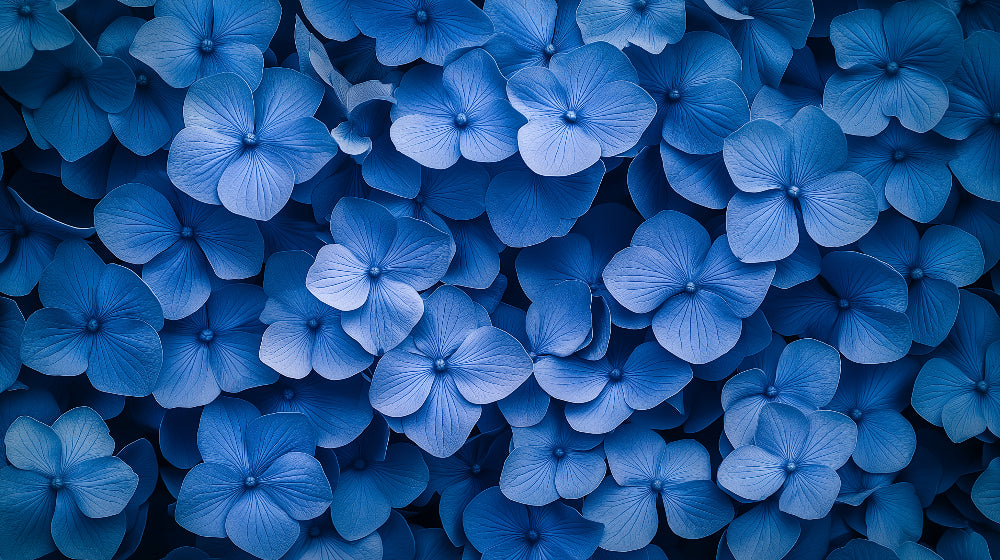 Ce papier peint mural floral présente une mer enchanteresse de fleurs d'hortensia dans des nuances fascinantes de bleu. Chaque pétale est magnifiquement détaillé, créant une riche tapisserie de teintes bleu marine profond et bleu poudre qui semblent presque translucides dans leur délicatesse. Le design de papier peint à fleurs bleues offre une expérience immersive, avec des fleurs superposées créant profondeur et dimension sur un fond plus sombre.