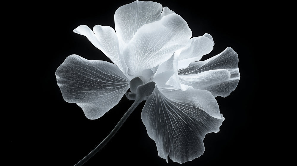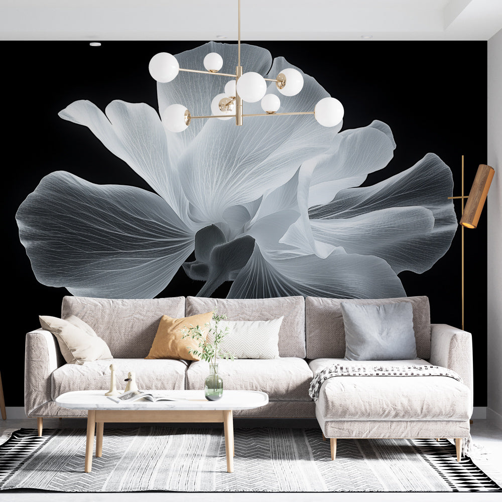 Ce papier peint floral noir et blanc présente une photographie macro fascinante d'une seule fleur capturée dans un détail monochromatique époustouflant. Les pétales délicats se déploient sur un fond noir profond, créant un contraste dramatique qui met en valeur chaque veine complexe et chaque texture subtile. La fresque murale botanique atteint une translucidité presque semblable à une radiographie, transformant une simple fleur en une œuvre d'art contemporaine éthérée.