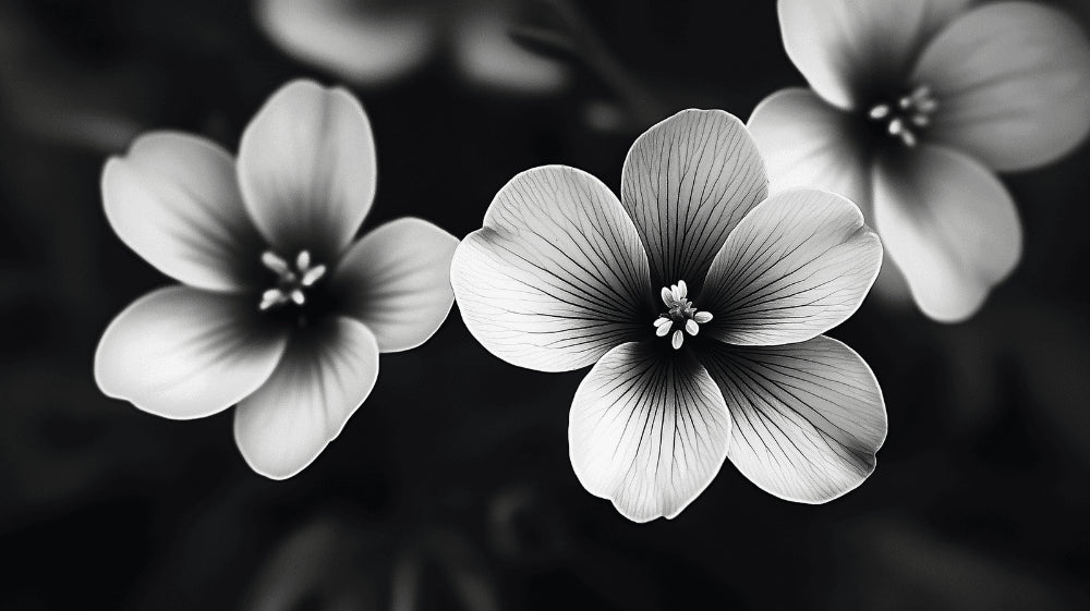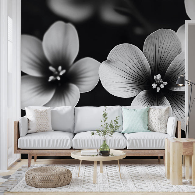 Ce papier peint floral noir et blanc présente une photographie macro saisissante de fleurs délicates sur un fond noir profond. Le détail exquis capture chaque ligne et veine subtile des pétales, créant une composition monochromatique fascinante. La fresque murale botanique met en scène des fleurs immaculées à cinq pétales avec des centres complexes, leurs formes rendues en tons de gris nets qui soulignent la symétrie parfaite de la nature.