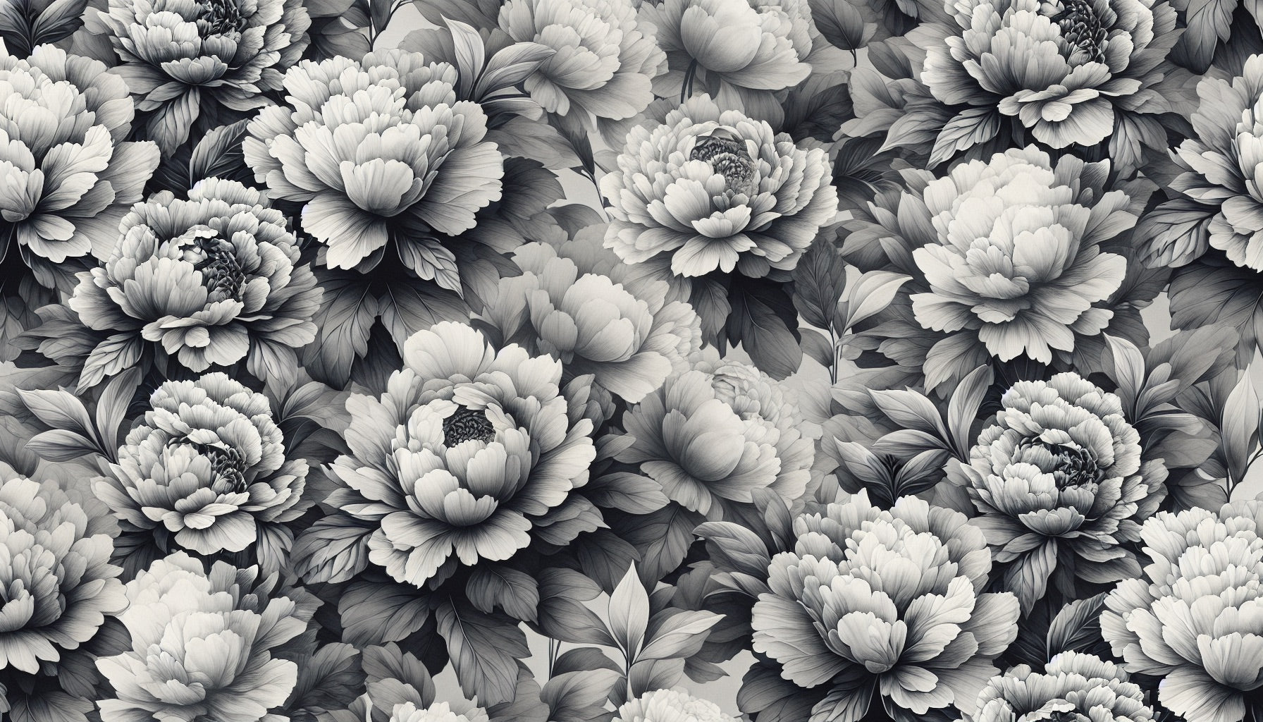 Ce papier peint floral noir et blanc présente une composition magistrale de grandes pivoines luxuriantes rendues en tons de gris sophistiqués. Chaque fleur est minutieusement détaillée, avec des couches de pétales délicats créant un jeu complexe de lumière et d'ombre. Le papier peint botanique monochrome offre une interprétation audacieuse et contemporaine des motifs floraux classiques, où chaque pétale et feuille est capturé avec une précision photographique.