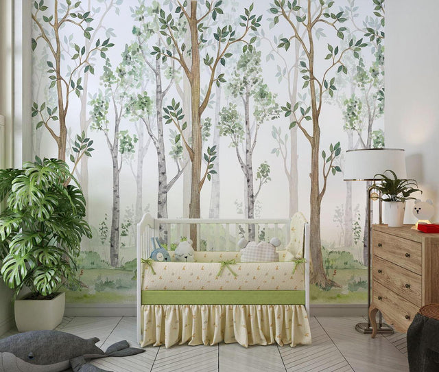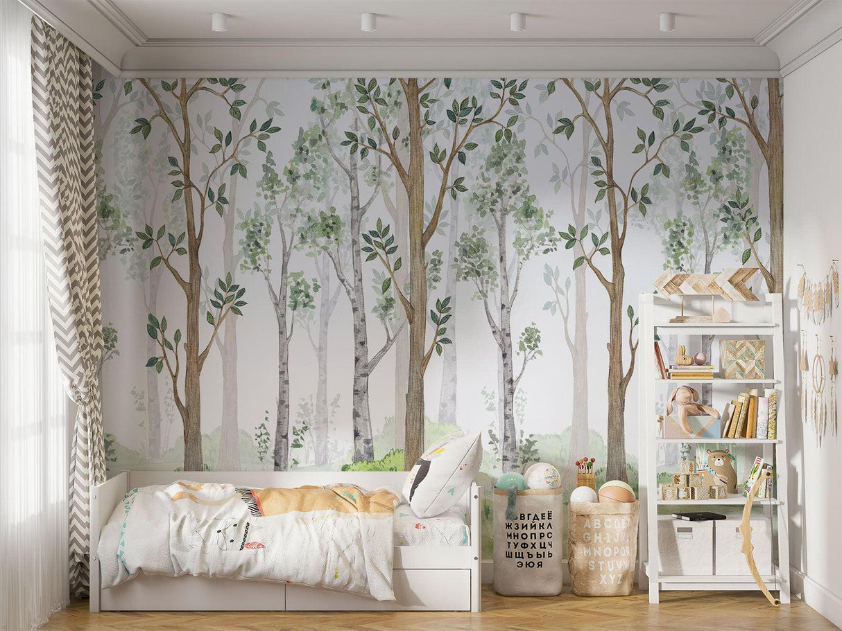 Papier Peint Mural Forêt | Design Arbre Aquarelle Avec Feuilles Vertes