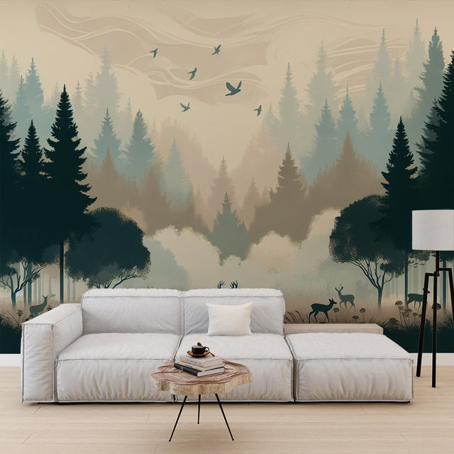 Papier Peint Mural Forêt | Pins Brumeux avec Faune
