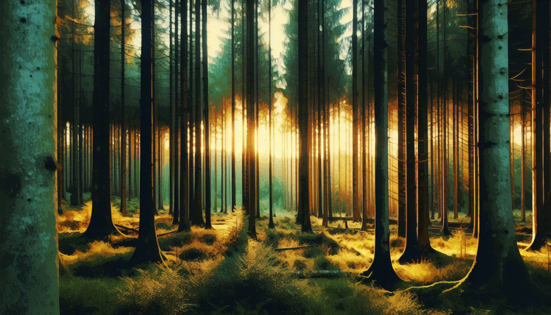 Papier Peint Mural Forêt | Pins Mystiques à l'Aube Dorée