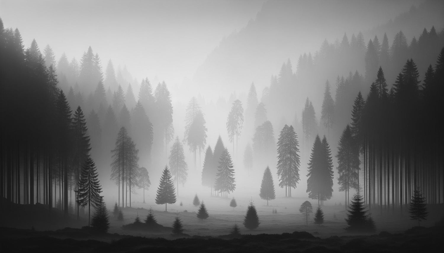 Papier Peint Mural Forêt | Pins Brumeux en Monochrome