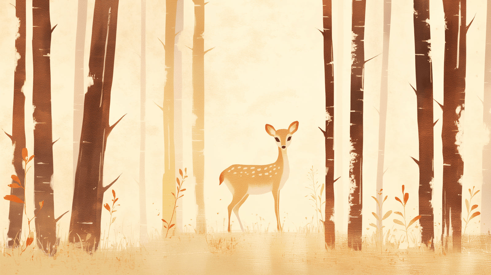 Ce papier peint animal de la forêt enchanteur capture une scène magique de la forêt dans des tons chauds d'ambre et de brun. Des troncs d'arbres majestueux s'élèvent sur un fond crème doux, créant profondeur et perspective, tandis qu'un cerf doux et un renard joueur donnent vie à la forêt. Le design de fresque forestière présente des détails délicats comme la neige qui tombe, le feuillage éparpillé et l'écorce texturée qui ajoutent de la richesse à la composition naturelle.