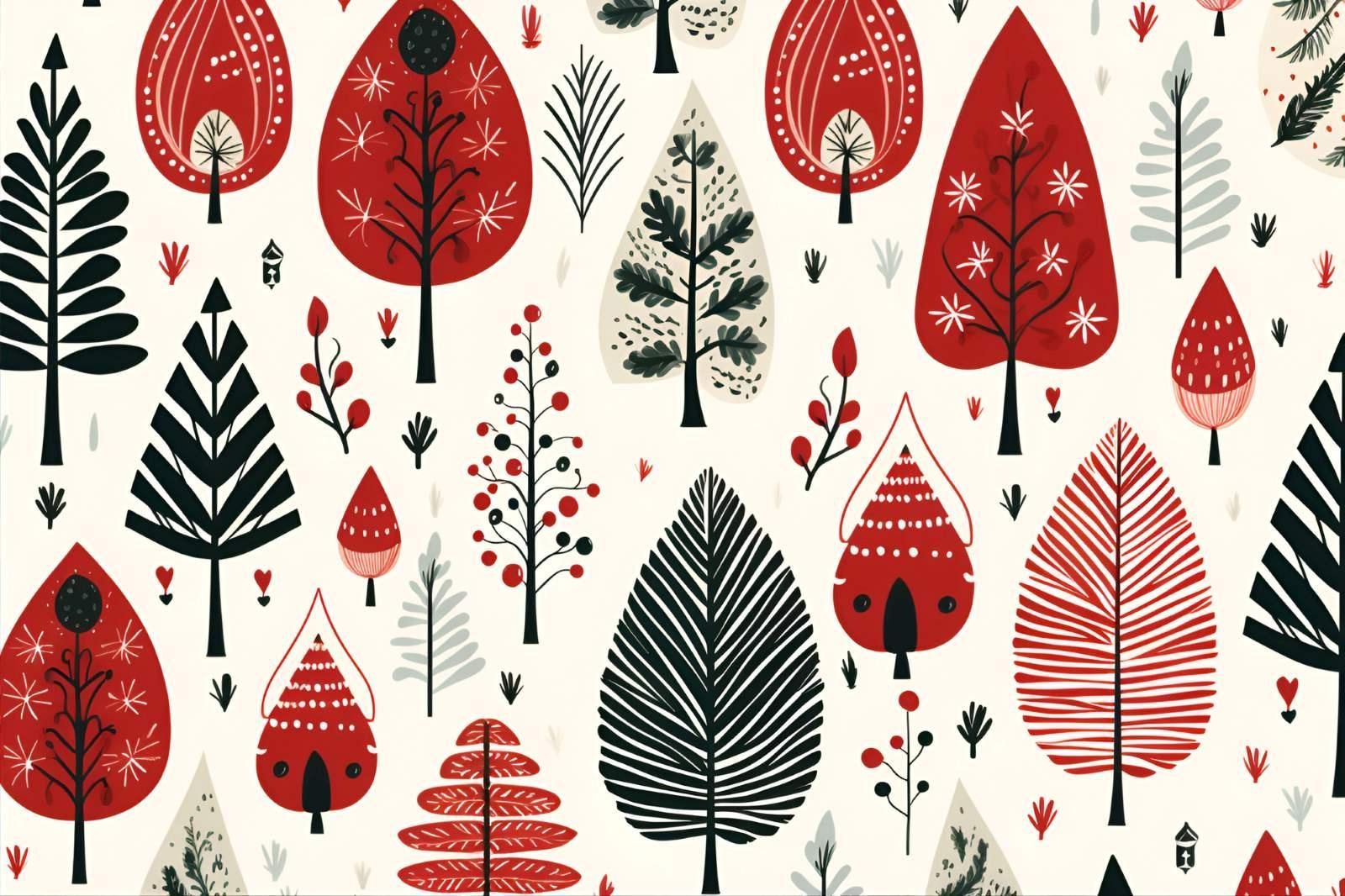 Ce papier peint forêt nordique présente une charmante composition d'arbres stylisés dans des teintes rouge riche et noir profond sur un fond blanc crème. Chaque élément est soigneusement conçu avec une précision géométrique mettant en valeur des motifs de feuilles saisissants, des textures ponctuées et des détails délicats en forme d'étoiles. Le papier peint arbre scandinave combine des maisons féeriques fantaisistes et des branches garnies de baies qui créent un motif rythmique et moderne plein de charme naturel.