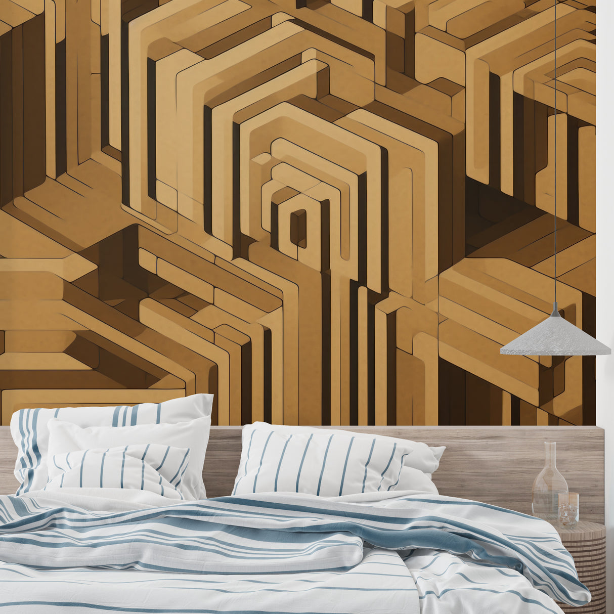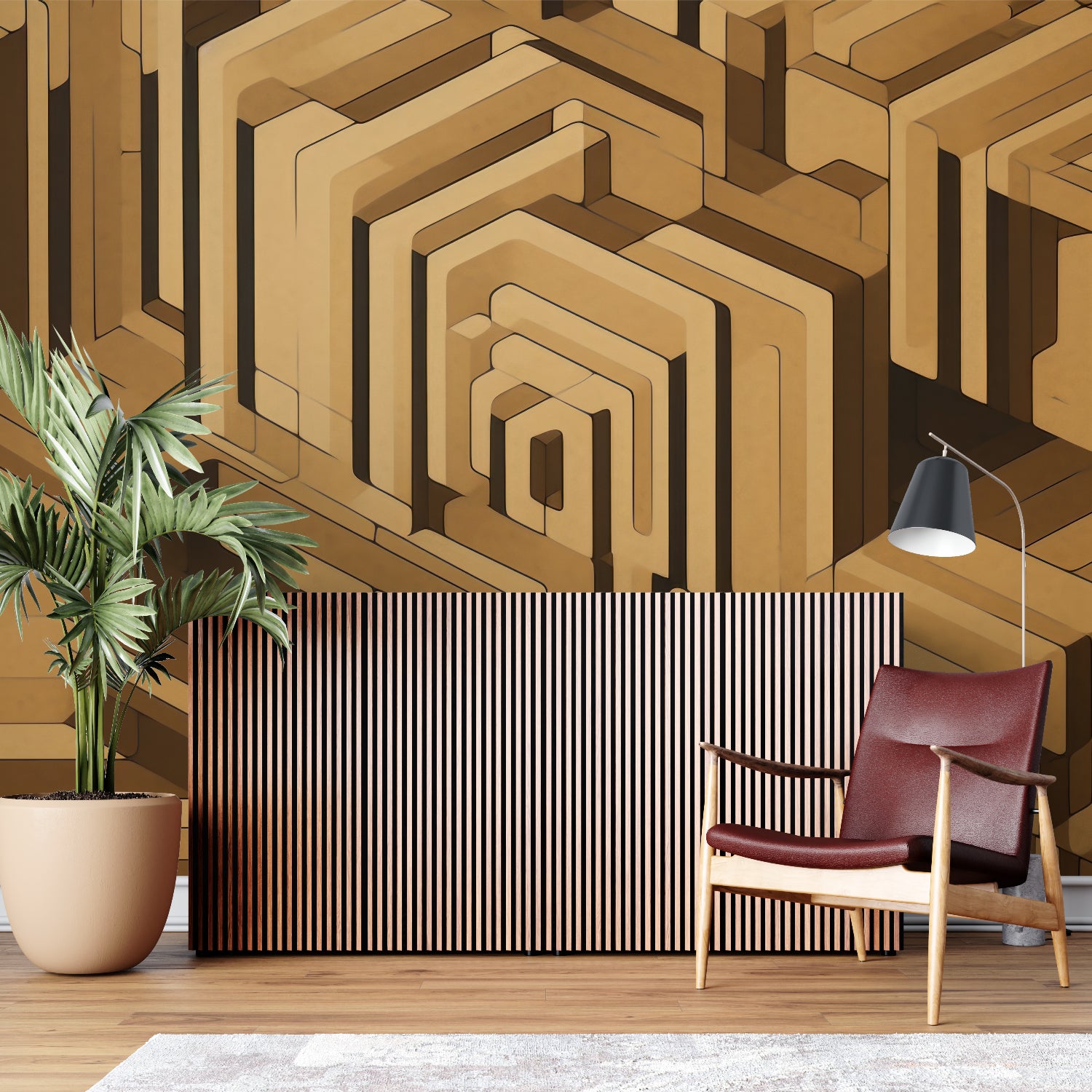 Papier Peint Mural Géométrique | Design Labyrinthe Doré 3D