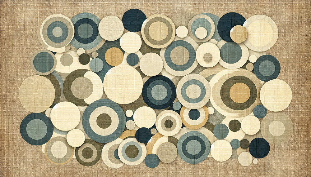 Ce papier peint géométrique à cercles présente une composition envoûtante de sphères et d'anneaux qui se chevauchent dans une palette sophistiquée de bleu marine, beige doux et tons chauds dorés. Sur un fond texturé rappelant une toile, le papier peint circulaire moderne crée un effet de profondeur fascinant grâce à son design en couches, où des cercles concentriques de tailles variées dansent à la surface dans une disposition harmonieuse.